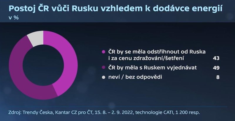 49 % obyvatel si také myslí, že bychom měli vyjádnávat s Ruskem o dodávkách plyny. 43 % obyvatel si naopak myslí, že se máme od ruského plynu odstřihnout.