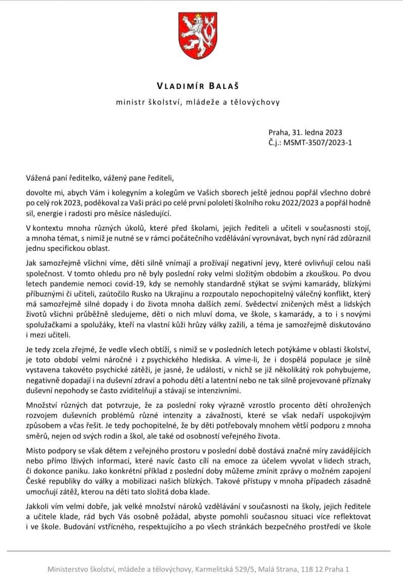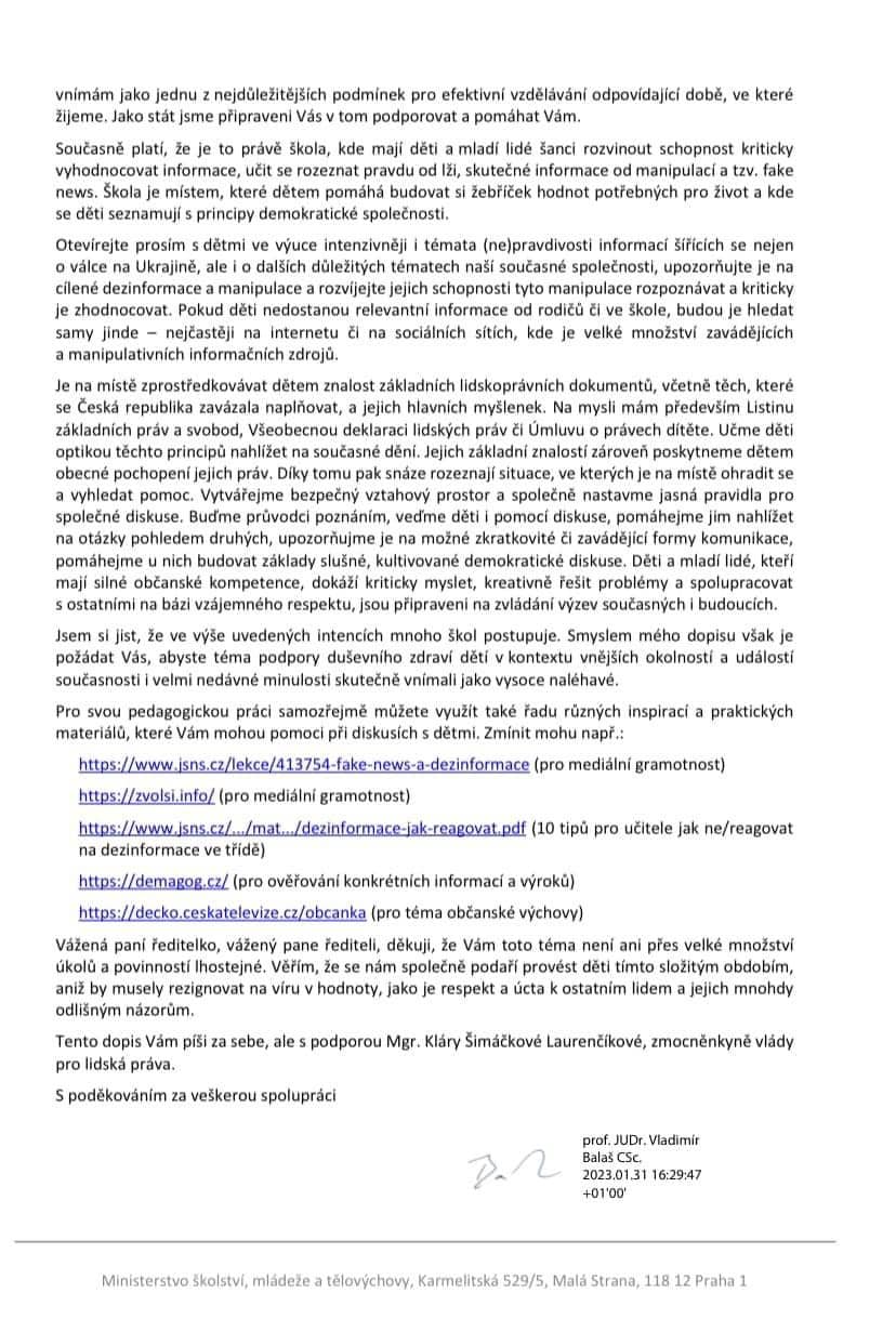 Pane ministře, chci Vás ujistit, že mi téma dezinformací a problematika psychického stavu dětí není lhostejná a snažíme se ve škole s těmito problémy vypořádat. Nemyslím si však, že by nám v tomto snažení byl Váš dopis nějakým přínosem.