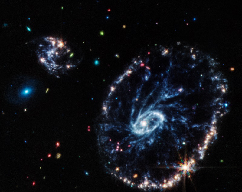 Cartwheelova galaxie pořízena Webbovým teleskopem vzdálená 500 milionů světelných let.
