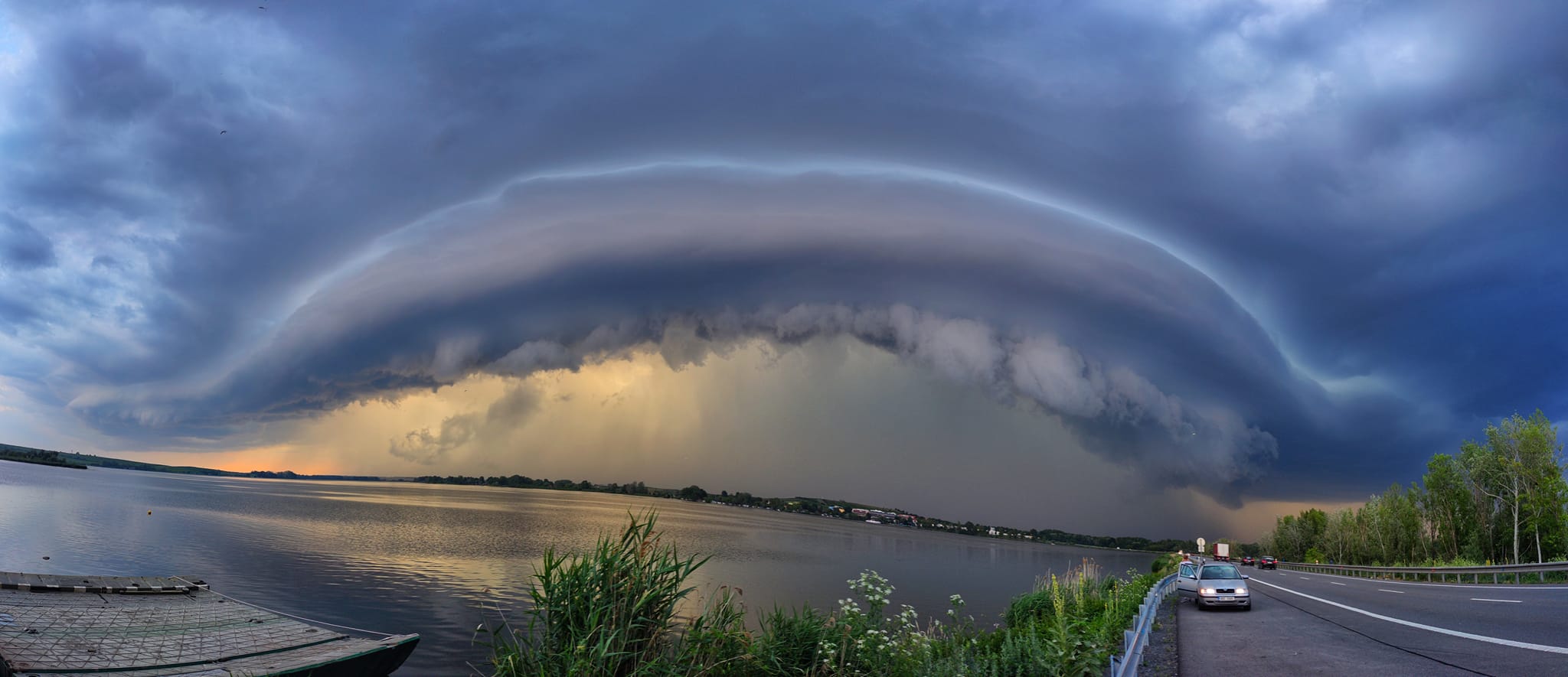 Dnes po extrémním nedělním horku den plný bouřek a různých meteorologických jevů, v Praze roll cloud, na fotografii čelo přicházející bouřky, tzv. shelf cloud na Pálavě.