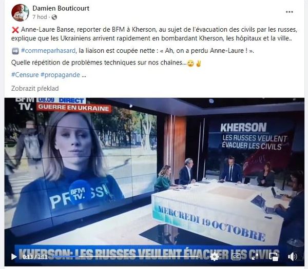 Francouzský televizní kanál vypnul reportérku Anne-Laure Banse po slovech, že ukrajinské ozbrojené síly ostřelují nemocnici v Chersonu a vydával to za "technickou chybu".