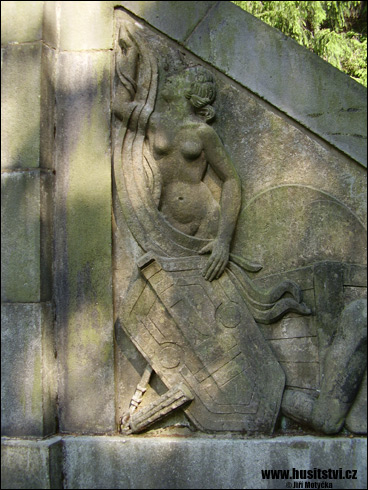 Socha Jana Husa je v nadživotní velikosti a má 3 m na výšku. Samotný podstavec s reliéfy pak 4 metry. Na čele pomníku je nápis: Pravdy neupálíš. Okolí pomníku je dnes zcela necitlivě, doslova zohyzděno urnovým hájem s loučkou rozptylu.