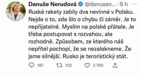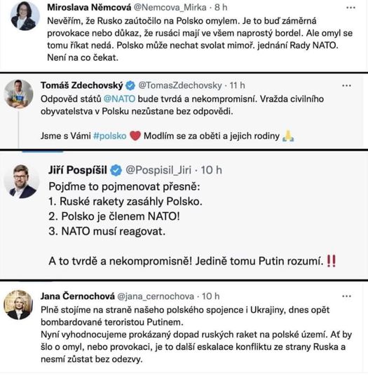 V médiích proběhla mediální histerie, kdy bylo Rusko osočováno z toho, že na polské území dopadla ruská raketa. „Čeští“ unijně-ukrajinští politici ihned vyzývali k odvetným akcím NATO.