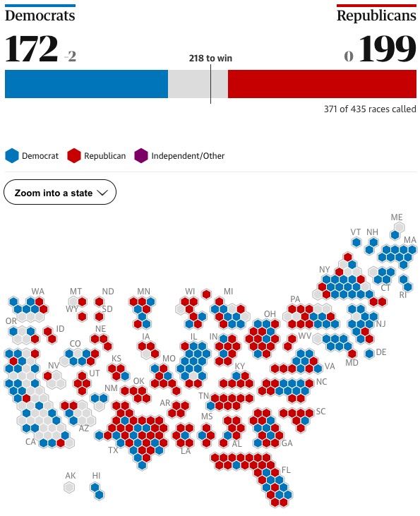 (stav k 13:00) Zatím stále není rozhodnuto, Ve sněmovně reprezentantů (angl. House) Mají zatím Republikáni náskok 199 vs. 172, ale sčítání stále probíhá a pro většinu ve sněmovně je potřeba získat 218 křesel.