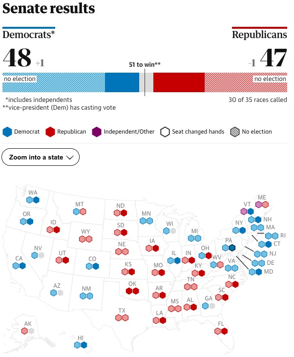 Volby do senátu jsou velmi vyrovnané, volí se pouze třetina, takže i když Republikáni zatím získali více senátorů, na většinu to nemusí stačit. Zatím mají více křesel Demokraté, 48 vs. 47, pro většinu je zapotřebí 51.